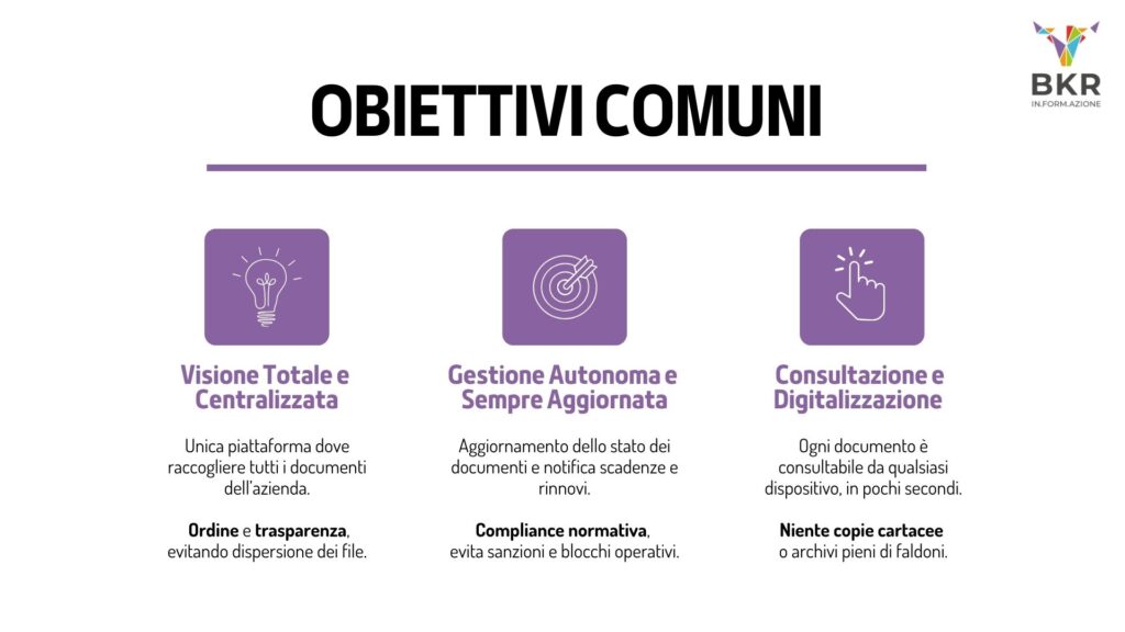 - Compliance normativa costante: evita sanzioni, blocchi operativi e criticità legate a documenti scaduti o mancanti.